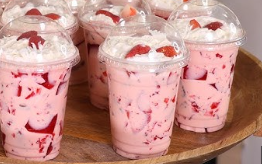 Gelatina de fresa fresca acompañada de una capa suave de crema batida. Un postre clásico y delicioso.